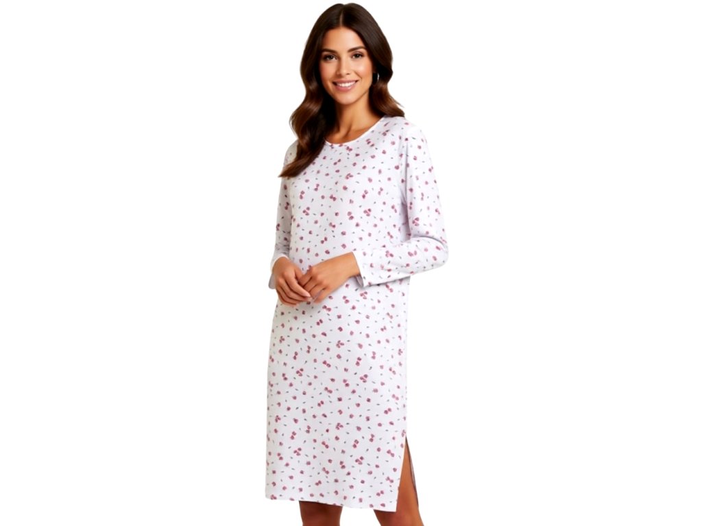 Dámská noční košile má výstřih do U. Rukávy jsou dlouhé.