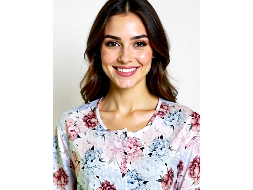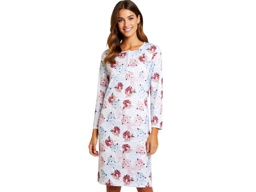 Dámská noční košile má výstřih do U. Rukávy jsou dlouhé.