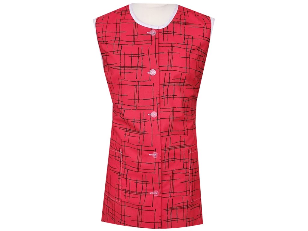 který zaručuje pohodlnost. Šatová zástěra Foltýn je vyrobena v provedení bez rukávů a zdobená bílou paspulkou. V bocích jsou našité dvě prostorné kapsy.