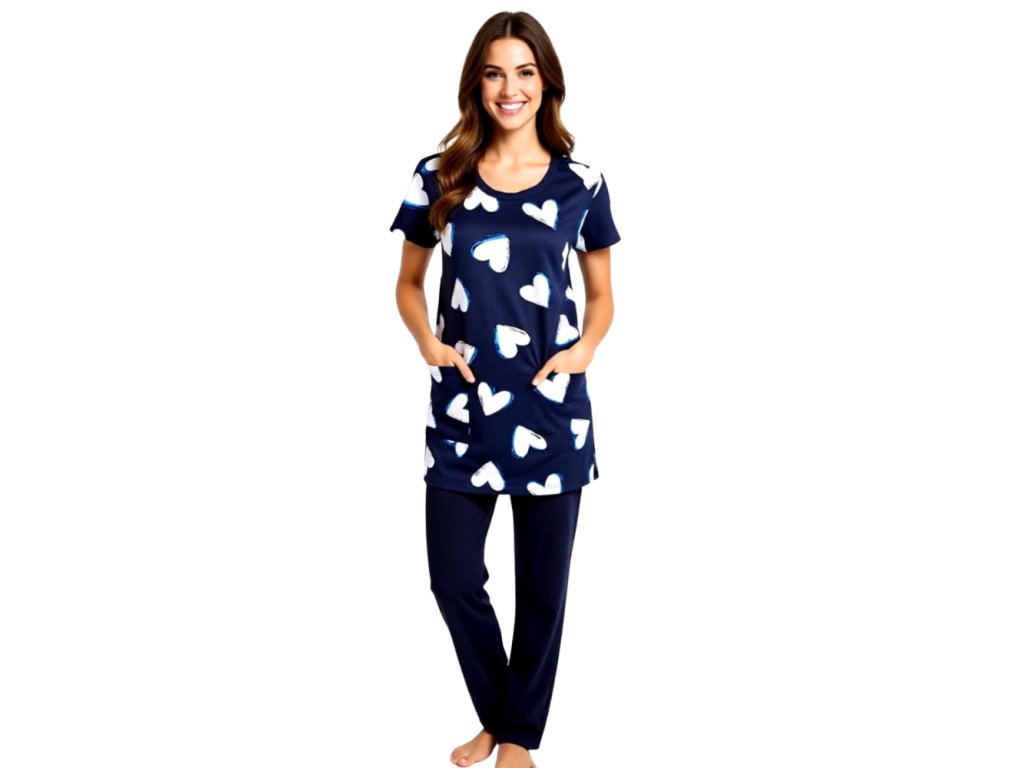 Dámský domácí oblek Foltýn DDO 08. Česká výroba. Materiál 100% bavlna - úplet. Vršek v provedení krátký rukáv. Elegantní vzor na téma srdce, dvě praktické kapsy na přední straně. Pohodlné tmavě modré kalhoty, vyměnitelná guma v pase. Velikost S - 7XL.