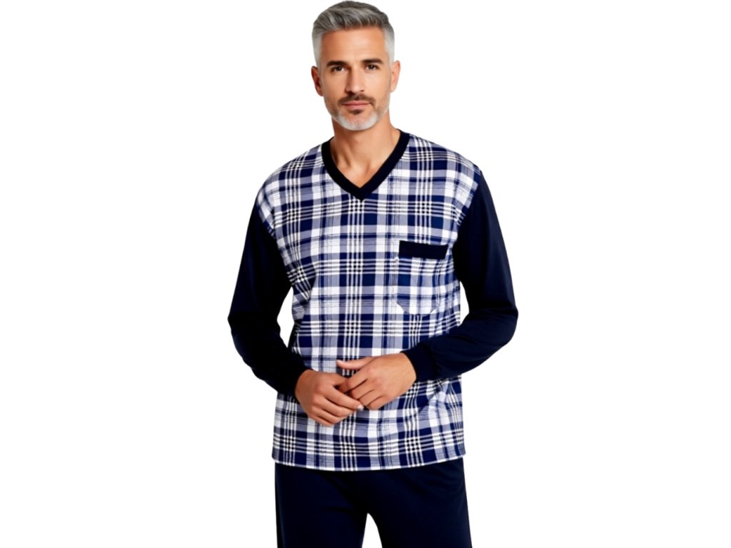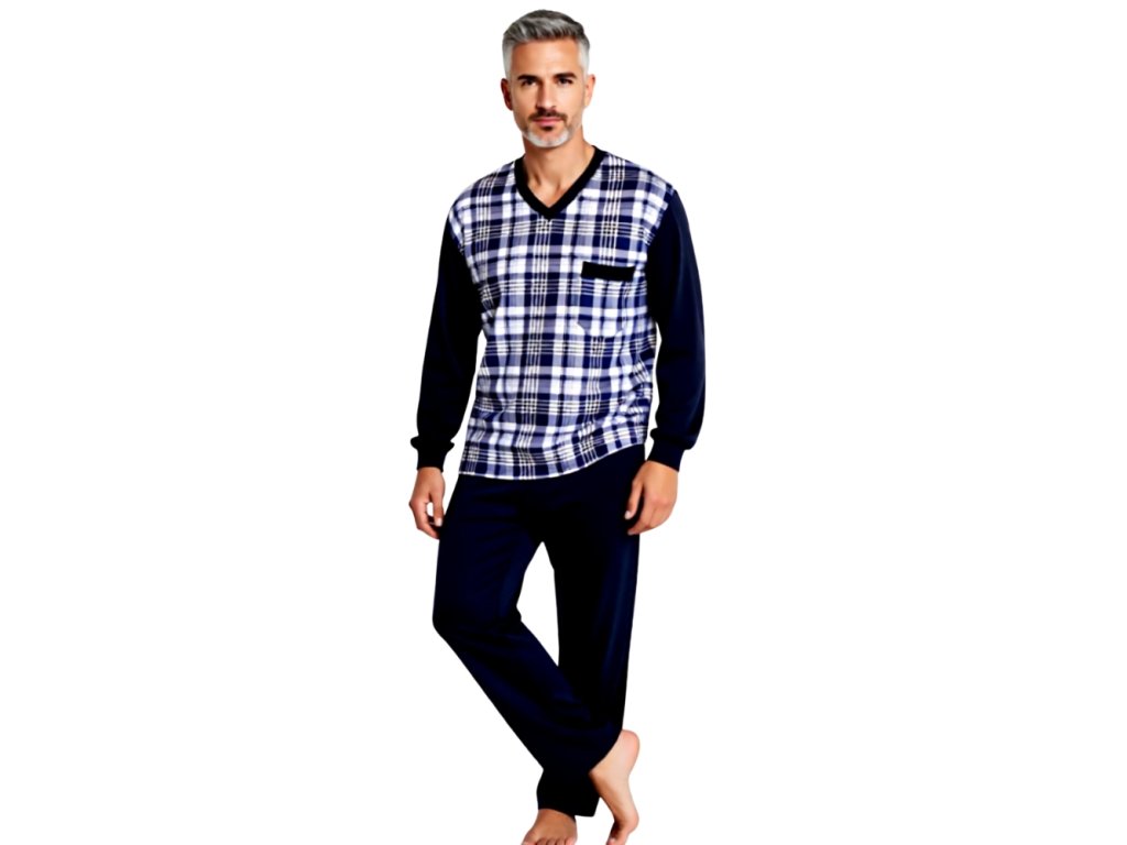 Pánské pyžamo úplet dlouhé to je kvalitní pánské pyžamo od firmy Foltýn. Moderní střih zaručující maximální pohodlnost a eleganci. Vrchní díl má výstřih do V. Kalhoty jsou volné. V pase opatřené gumou v tunýlku, která se dá vyměnit. Pánské pyžamo úplet dlouhé je vyrobeno z jemně česaného bavlněného úpletu ze 100 % bavlny. Tento kvalitní materiál je vzdušný a velice příjemný. Způsob ošetřování: praní na 40°C, žehlení.