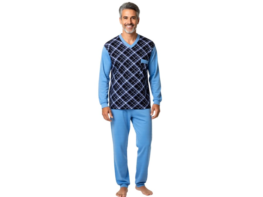 Pánské pyžamo úplet dlouhé to je kvalitní pánské pyžamo od firmy Foltýn. Moderní střih zaručující maximální pohodlnost a eleganci. Vrchní díl má výstřih do V. Kalhoty jsou volné. V pase opatřené gumou v tunýlku, která se dá vyměnit. Pánské pyžamo úplet dlouhé je vyrobeno z jemně česaného bavlněného úpletu ze 100 % bavlny. Tento kvalitní materiál je vzdušný a velice příjemný. Způsob ošetřování: praní na 40°C, žehlení.