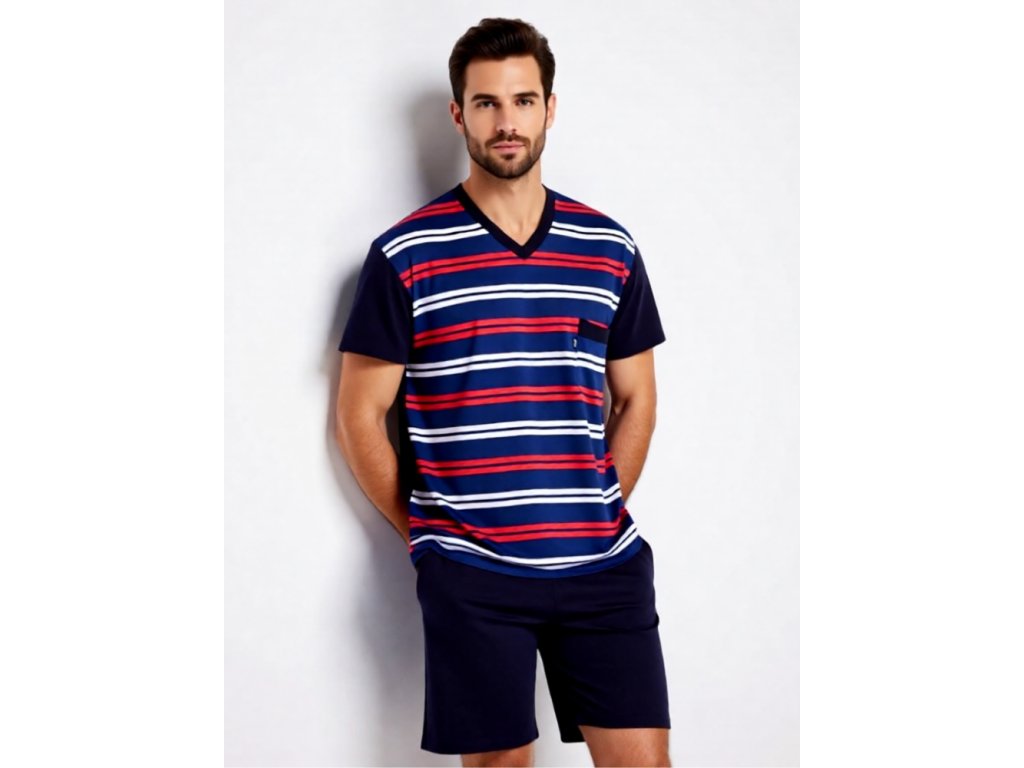 Pánské pyžamo krátké úplet to je kvalitní pánské pyžamo od firmy Foltýn. Moderní střih zaručující maximální pohodlnost a eleganci. Vrchní díl má výstřih do V. Kalhoty jsou volné. V pase opatřené gumou v tunýlku, která se dá vyměnit. Pánské pyžamo je vyrobeno z jemně česaného bavlněného úpletu ze 100 % bavlny. Tento kvalitní materiál je vzdušný a velice příjemný. Způsob ošetřování: praní na 40°C, žehlení.