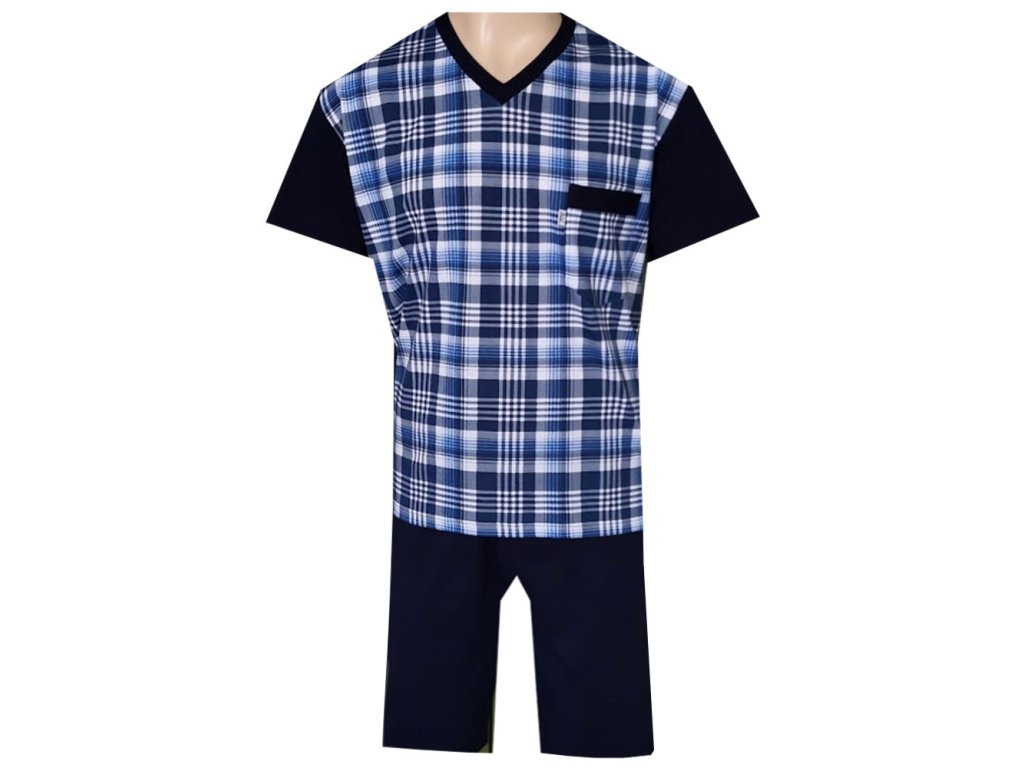 Pánské pyžamo krátké úplet to je kvalitní pánské pyžamo od firmy Foltýn. Moderní střih zaručující maximální pohodlnost a eleganci. Vrchní díl má výstřih do V. Kalhoty jsou volné. V pase opatřené gumou v tunýlku, která se dá vyměnit. Pánské pyžamo je vyrobeno z jemně česaného bavlněného úpletu ze 100 % bavlny. Tento kvalitní materiál je vzdušný a velice příjemný. Způsob ošetřování: praní na 40°C, žehlení.