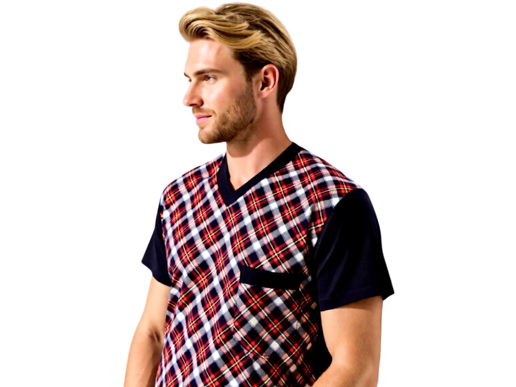 Pánské pyžamo krátké úplet to je kvalitní pánské pyžamo od firmy Foltýn. Moderní střih zaručující maximální pohodlnost a eleganci. Vrchní díl má výstřih do V. Kalhoty jsou volné. V pase opatřené gumou v tunýlku, která se dá vyměnit. Pánské pyžamo je vyrobeno z jemně česaného bavlněného úpletu ze 100 % bavlny. Tento kvalitní materiál je vzdušný a velice příjemný. Způsob ošetřování: praní na 40°C, žehlení.